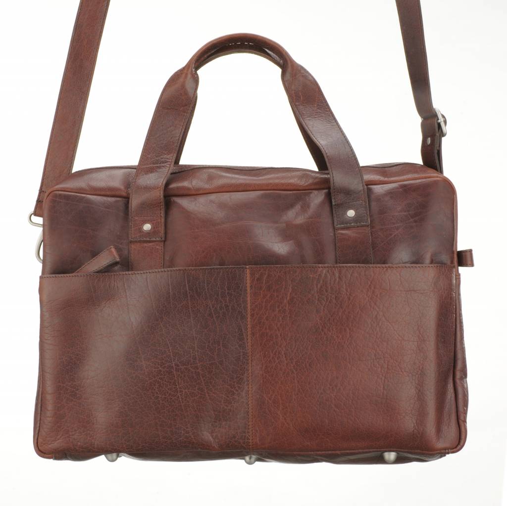 Deze ruime weekender is uitgevoerd in rund leder met een stoere uitstraling. De tas heeft diverse vakken, waaronder twee afsluitbare vakken aan de voorzijde van de tas. Voor het draagcomfort is een brede schouderband toegevoegd. De tas heeft een bovenrits en diverse ruime vakken aan de binnenzijde waarvan een softpocket voor het veilig opbergen van de tablet of laptop.