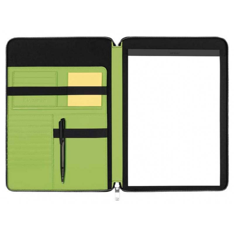 Strak vormgegeven A4 schrijfmap SKUBA (Senator) in diverse trendy kleuren. Met diverse vakken en afsluitbaar met ritssluiting. Geleverd inclusief pen, schrijfblok en memoblok.